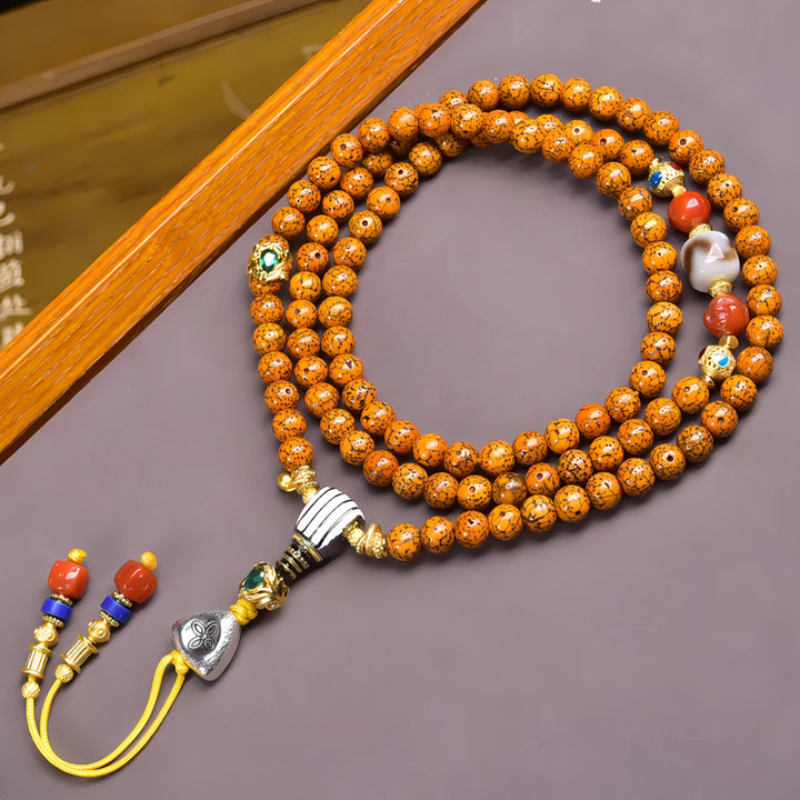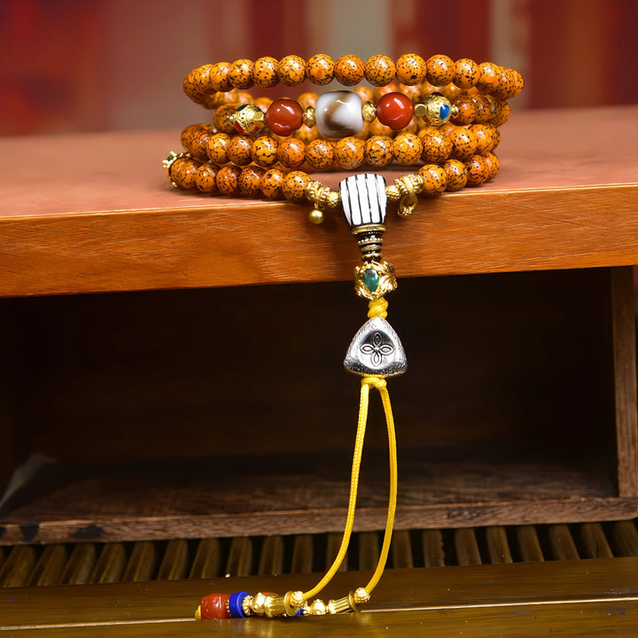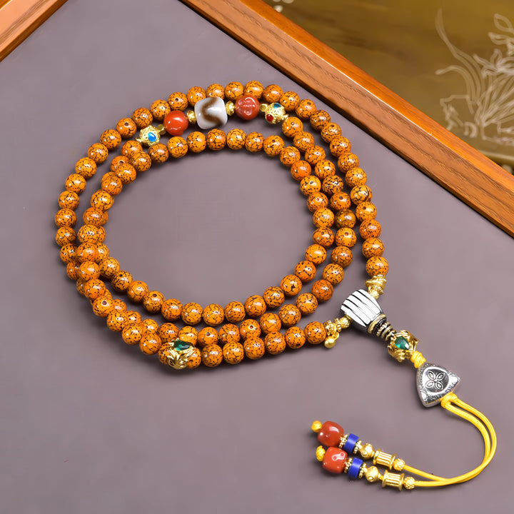 The Star-Moon Bodhi mala represents wisdom, devotion, and inner strength. The natural oxidation of the Bodhi seeds enhances spiritual purity, while the Tiger Tooth Dzi channels courage and protection. South Red Agate brings vitality and blessings, while the inlaid “Eye” bead provides watchful guardianship.