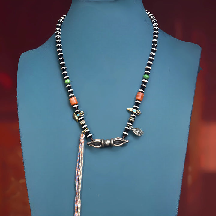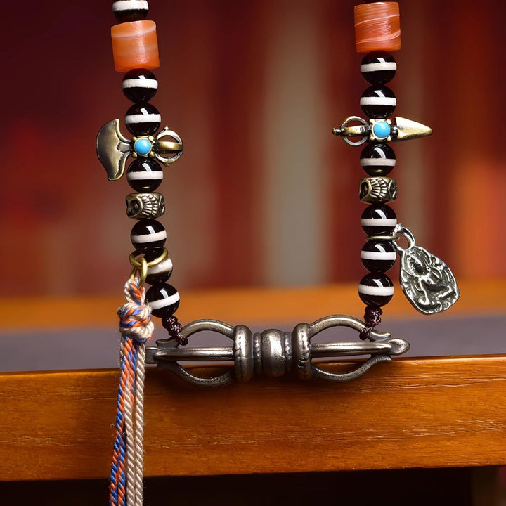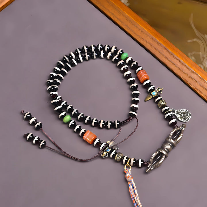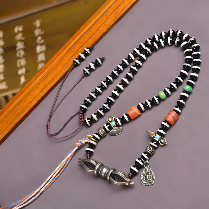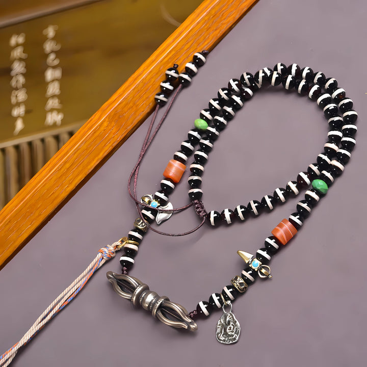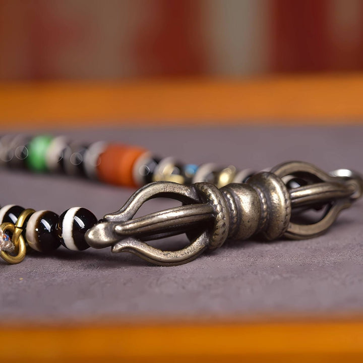 This antique line bead represents wisdom, fulfillment, and boundless blessings. It embodies the wish for life-long prosperity and success, carrying the energy of both protection and spiritual growth. The Vajra and ritual accessories further strengthen its aura of power, balance, and spiritual harmony.