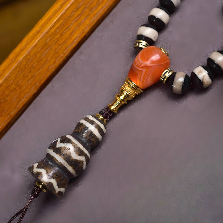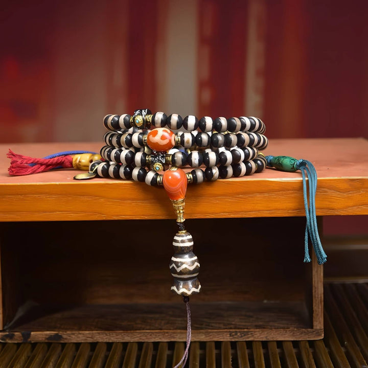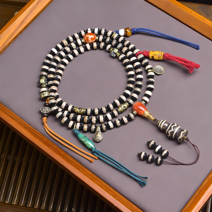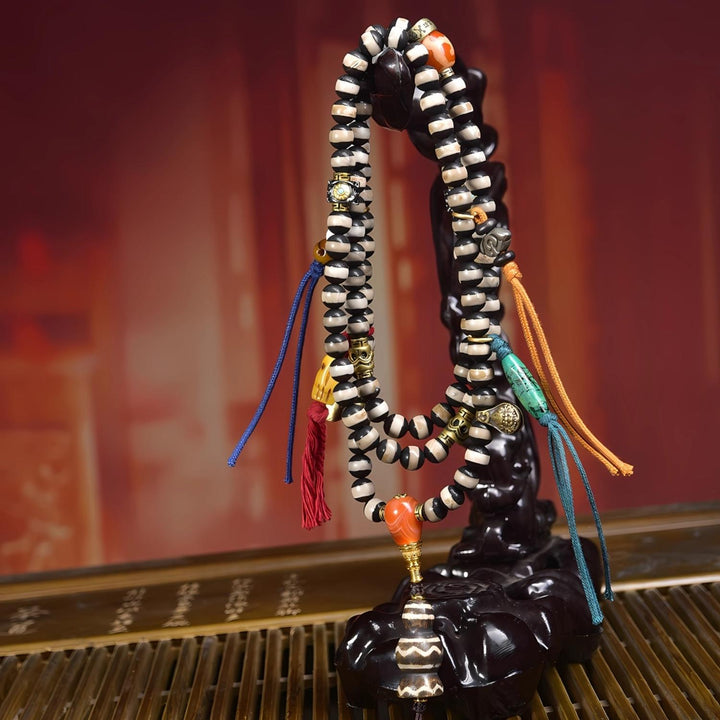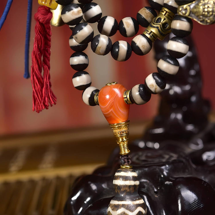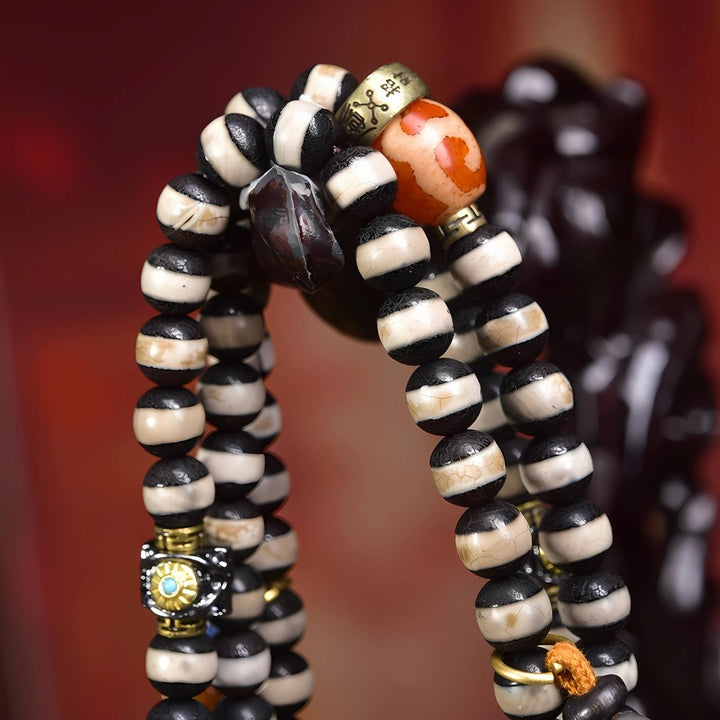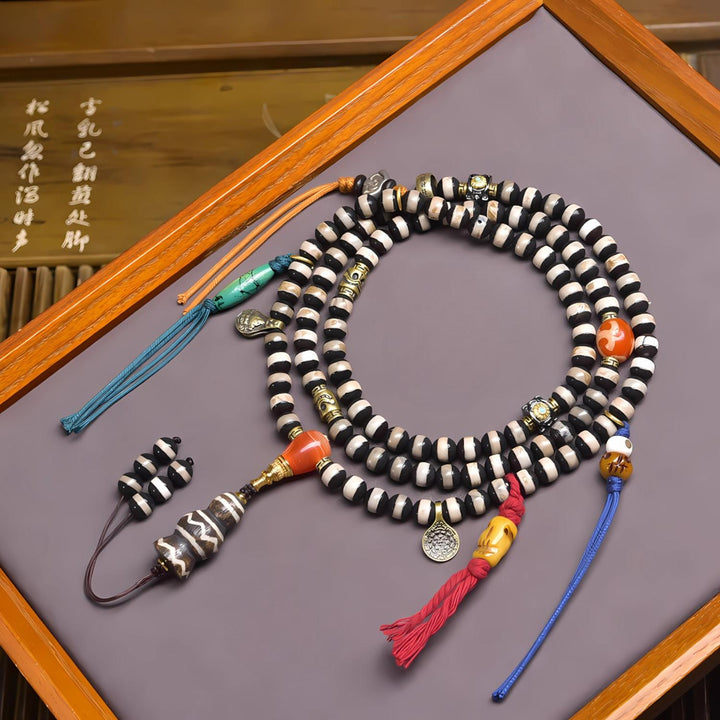 This antique line bead carries the energy of wisdom, blessings, and prosperity. The fine texture and natural patina reflect centuries of sacred heritage. Combined with the Green Tara Dzi (compassion and protection), Bon-Tik Dzi (auspicious power), Bagua charm (harmony and balance), and Yellow Jambhala (wealth and abundance), this mala becomes a multi-faceted talisman for prosperity, health, and spiritual awakening.