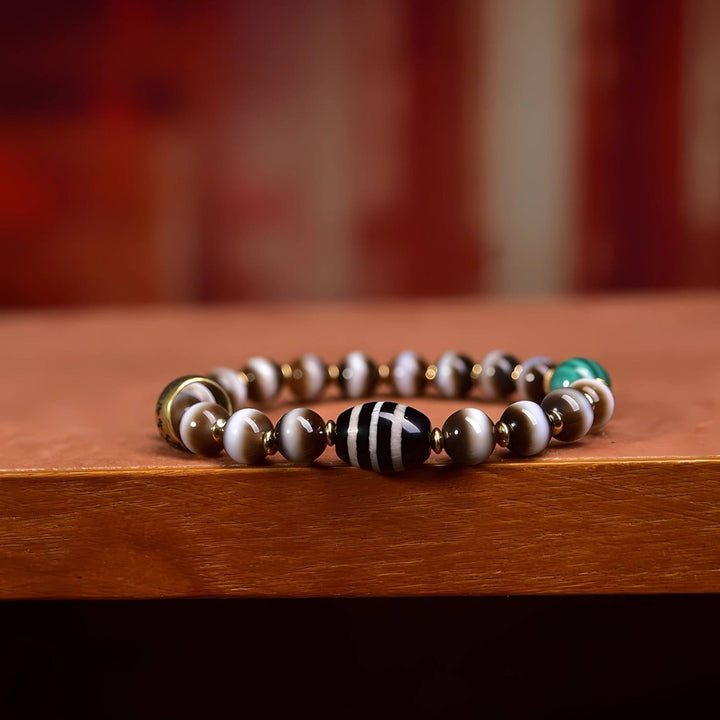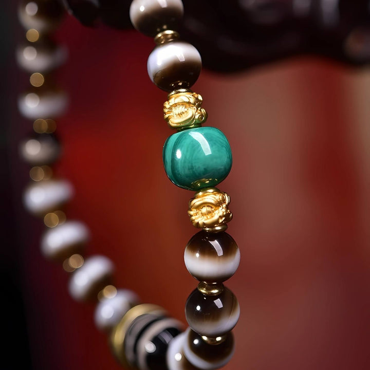 This antique thread bead is celebrated as a talisman of wisdom, prosperity, and blessings. Its fine patina reflects centuries of heritage, while the Three-Line Dzi enhances energy and focus. Paired with malachite for healing and bronze spacers for stability, this mala is both a collectible artifact and a powerful spiritual accessory for meditation and daily protection.