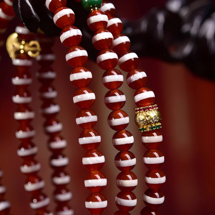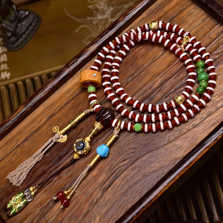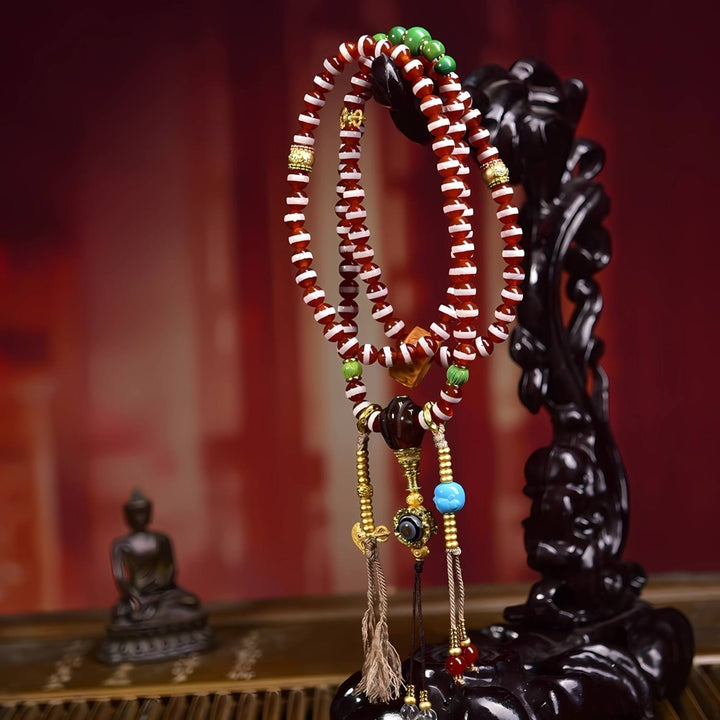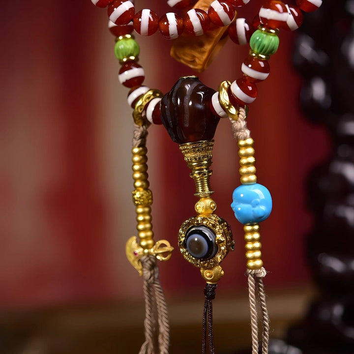 This antique line bead is revered as a talisman of wisdom, prosperity, and spiritual blessings. The weathered texture and natural patina embody centuries of history, while the thread lines enhance fortune and energy flow. Paired with sacred Dzi beads, turquoise, and ritual bronze elements, this mala becomes a powerful spiritual accessory, offering both protection and guidance in meditation and daily life.