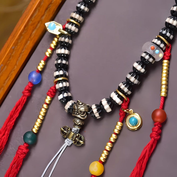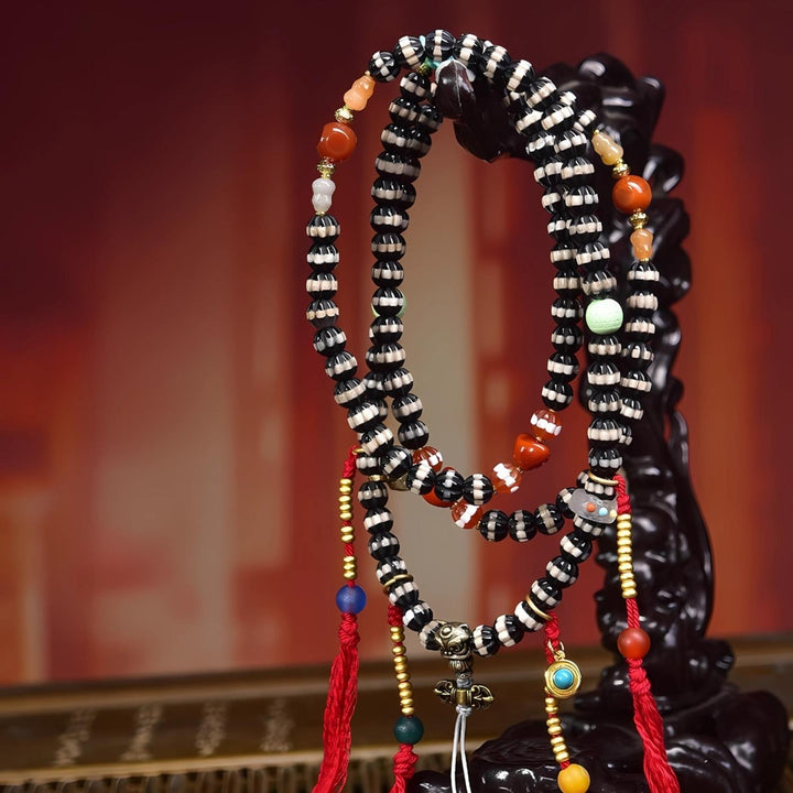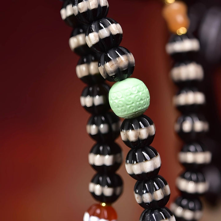 The Antique West Asian Thread Bead is revered as a talisman of wisdom, blessings, and prosperity. Its natural patina and fine texture reflect centuries of spiritual heritage, while its thread lines enhance fortune and energy flow. Paired with symbolic accents — the Yuanbao for wealth, lotus for purity, gourd for longevity, lion for protection, and phurba for spiritual power — this mala becomes a multi-layered spiritual treasure, ideal for meditation, protection, and daily blessing.