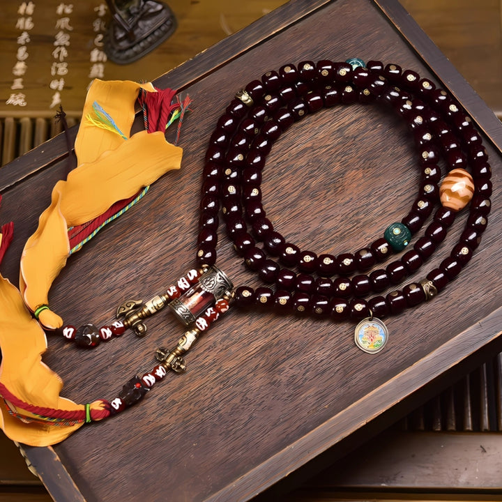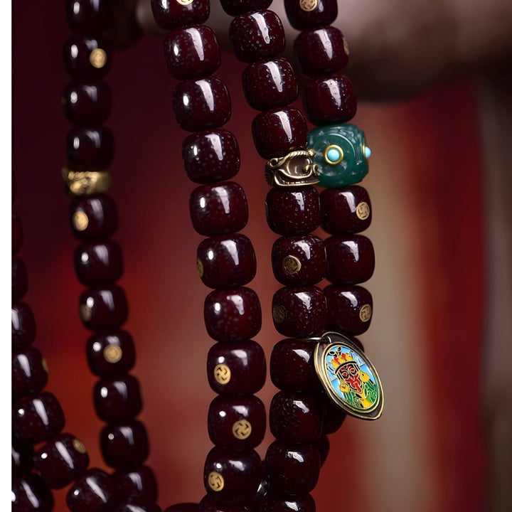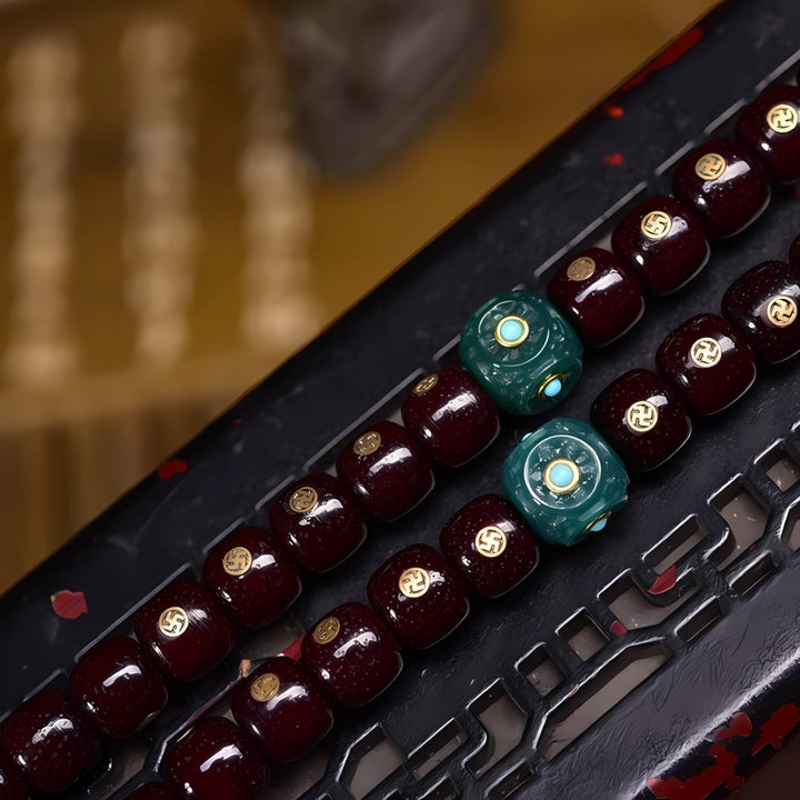 Cinnabar Blessed Bodhi Seeds Mala — Inlaid with Sacred Swastika Symbol