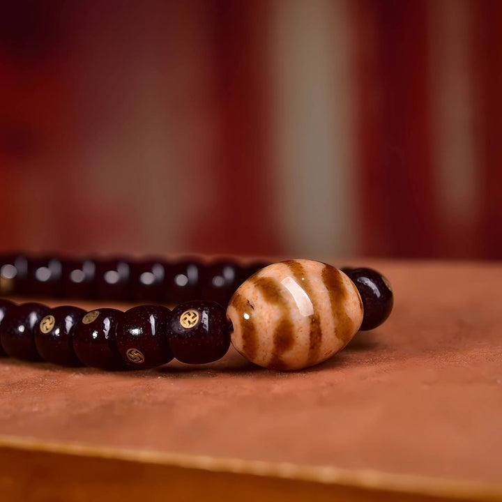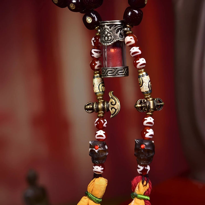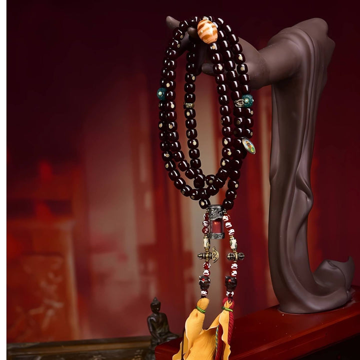 This cinnabar-infused Bodhi mala embodies longevity, protection, and prosperity. The sacred Swastika inlay amplifies auspicious energy, while cinnabar enhances vitality and spiritual strength. Tiger Tooth and Wealth-God Dzi beads strengthen courage, attract wealth, and provide protection against negativity. A powerful talisman for meditation, abundance, and lifelong blessings.