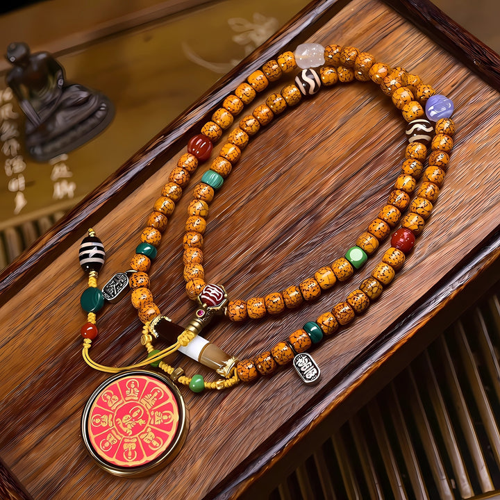 Every component is chosen for its energy and symbolism — from the Star-and-Moon Bodhi seeds for mindfulness, to the protective Garuda Guru bead, to the wealth-attracting White Crystal Pixiu.