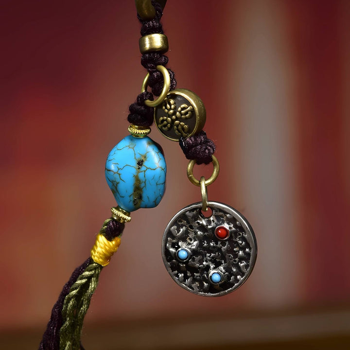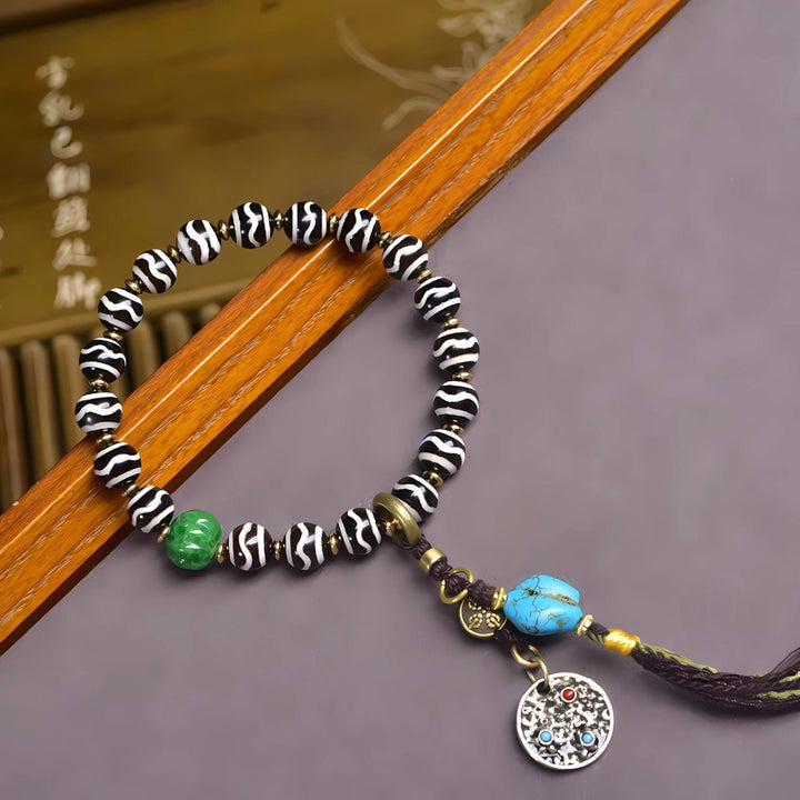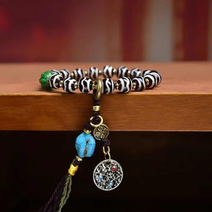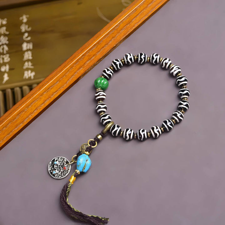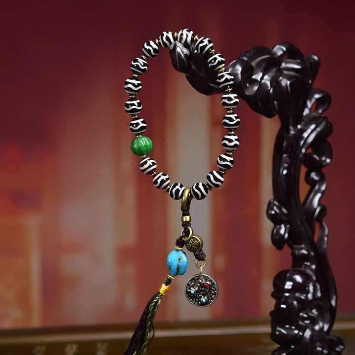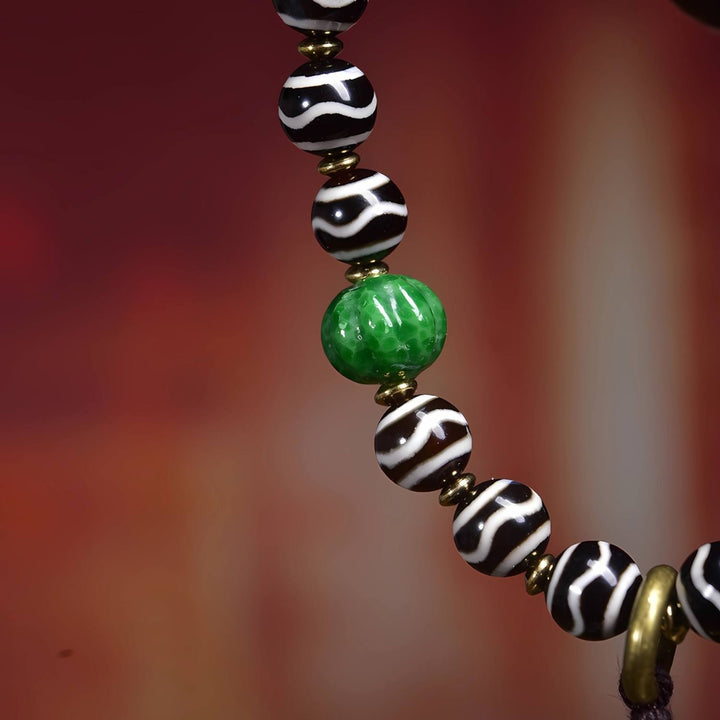 The Water Wave Dzi is considered a powerful talisman for prosperity, health, and stability. It is believed to harmonize the elements of metal and water, invigorating business, preventing loss of life force, and protecting against illness or misfortune. Paired with Liuli for spiritual clarity, bronze Vajra for protection, and turquoise for peace and balance, this mala strand carries deep symbolic strength and auspicious blessings.