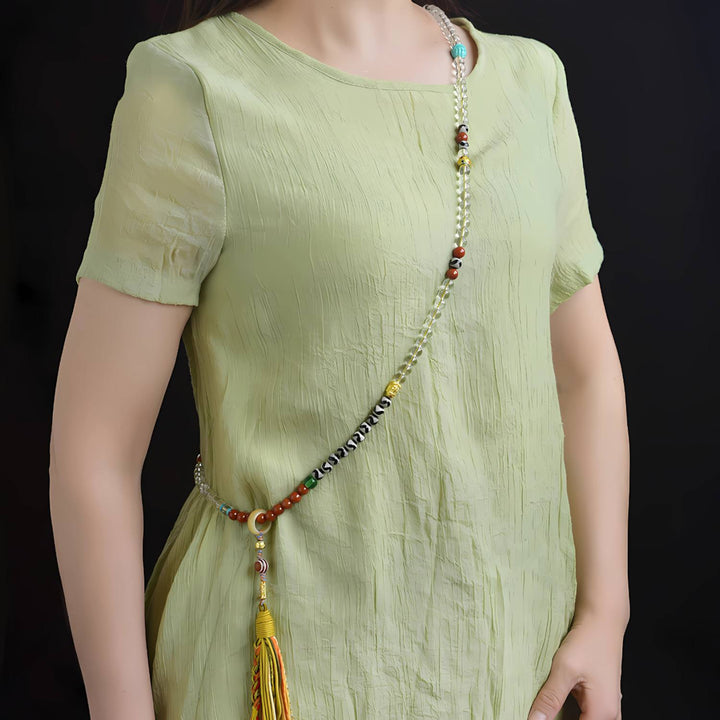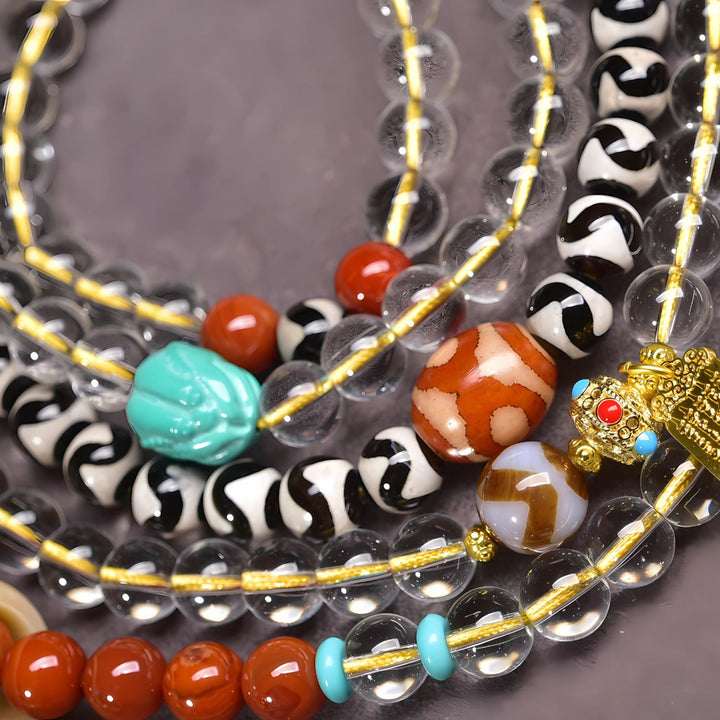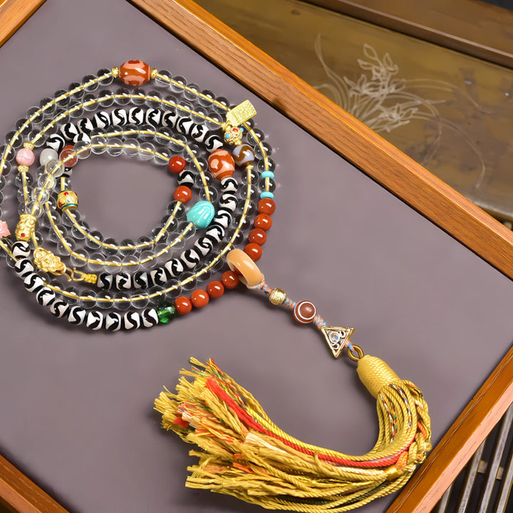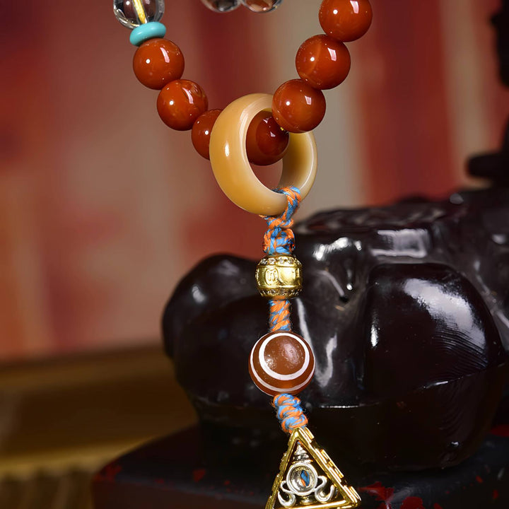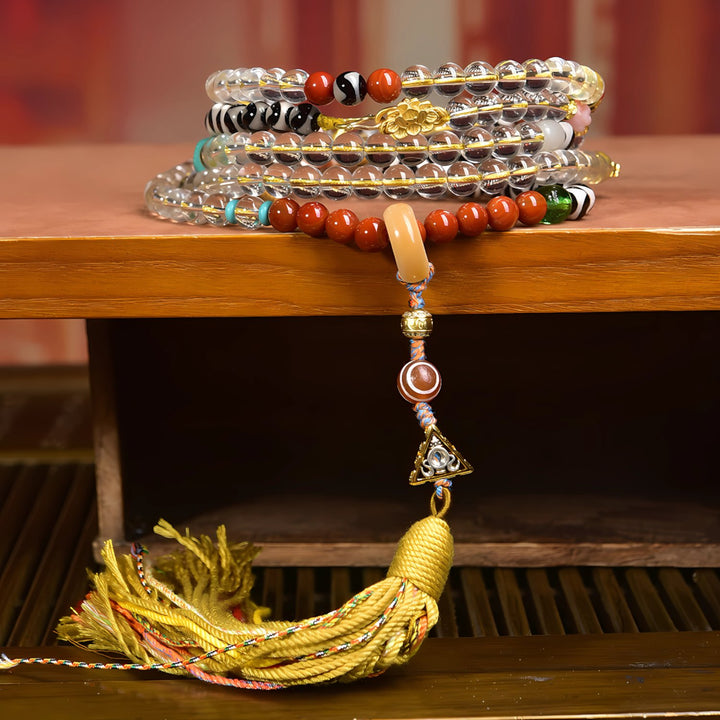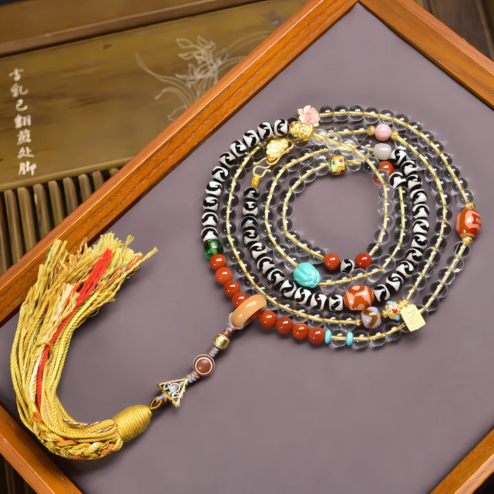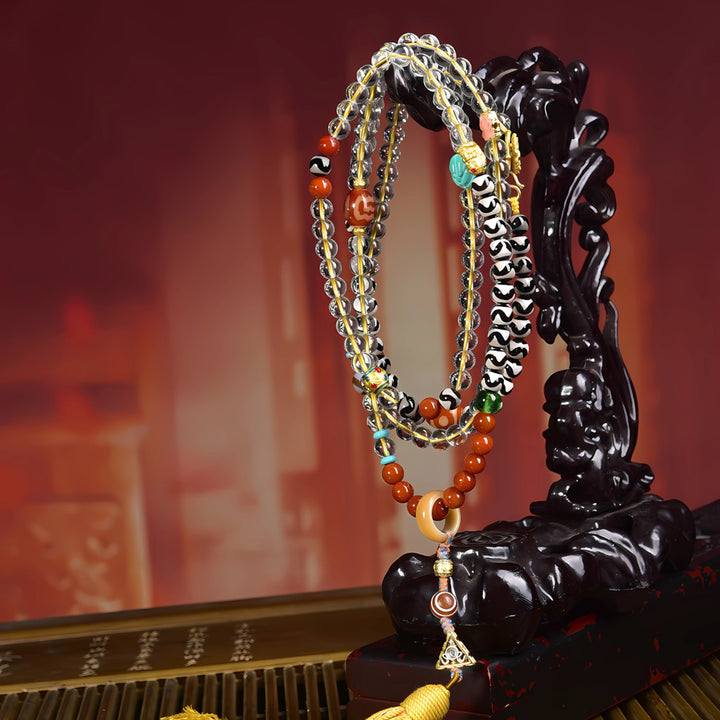 With South Red Agate for vitality, Liuli for clarity, Mandala Dzi for cosmic harmony, Garuda for overcoming negativity, and Red Heaven’s Eye for prosperity, this mala becomes a potent guardian necklace for both daily wear and spiritual empowerment.