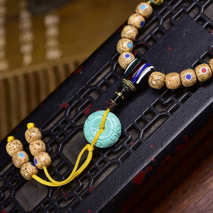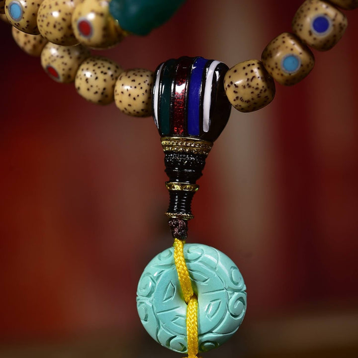 This 108-bead Star-Moon Bodhi mala is a treasure of wisdom, clarity, and protection. The Bodhi seeds symbolize awakening and meditation, while turquoise and agate bring harmony, wealth, and blessings. The Three-Faced Buddha bead represents compassion, wisdom, and strength, while the bronze phurba offers protection against negativity. Together, this mala embodies prosperity, spiritual strength, and auspicious energy, making it both a collector’s heirloom and a powerful tool for practice.