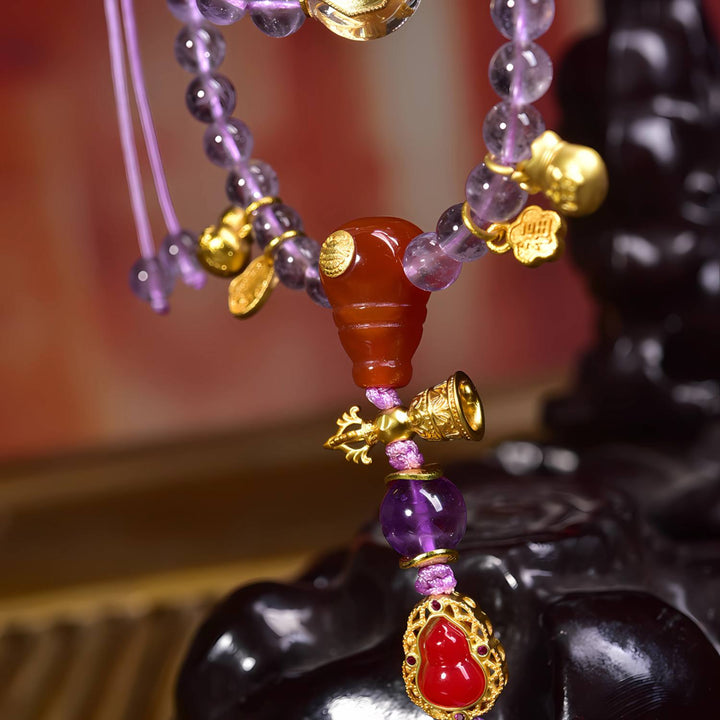 Enhanced with South Red Agate for vitality, white crystal for purification, and ritual implements for empowerment, this mala is both a sacred meditation tool and a potent charm of abundance and protection.