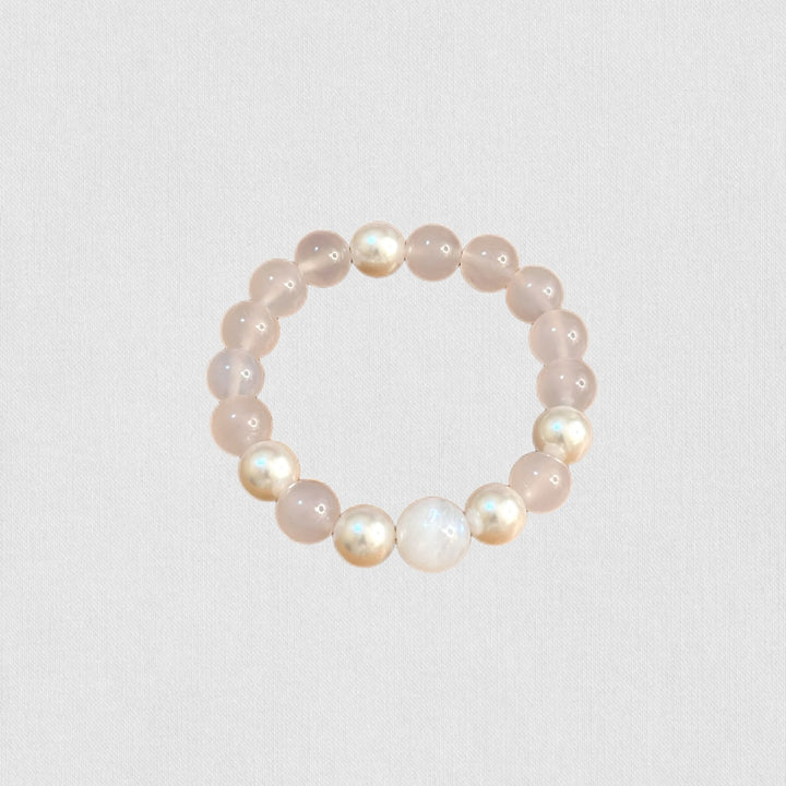 White agate is known as a stone of balance and calm, helping to release tension and bring inner stability. Pearls, often called “tears of the moon,” carry feminine energy that nurtures emotional harmony and inner wisdom. Together, they radiate serene elegance, balancing mind, body, and spirit.
