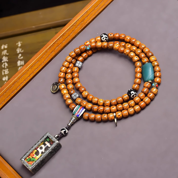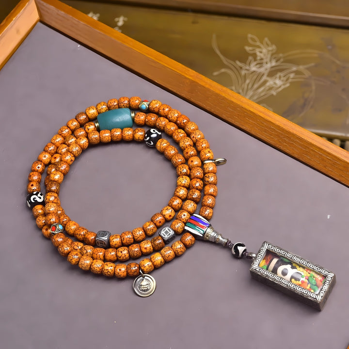 This handcrafted mala is not just a bracelet — it’s a talisman of energy. The aged Bodhi seeds symbolize wisdom and awakening. Each bead carries years of natural oxidation and spiritual potential. The Gawu box with the Wealth Dzi channels abundance and protection. Ideal for meditation, intention setting, and mindful living.