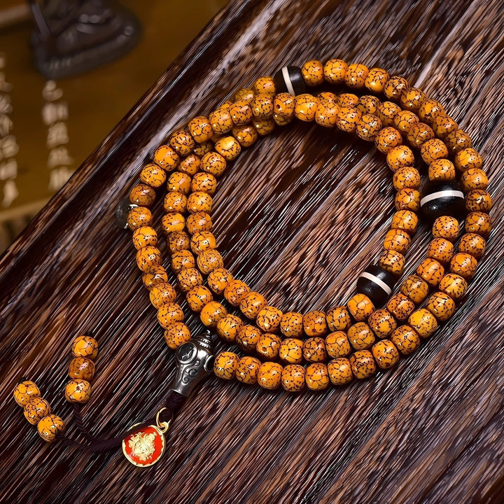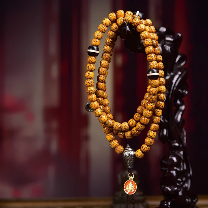 Old Seed Star-and-Moon Bodhi Mala — One-Line Dzi & Copper Guru Bead
