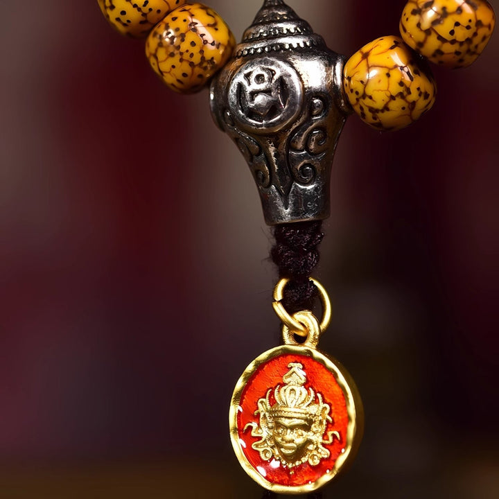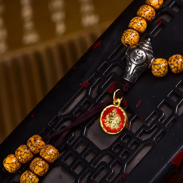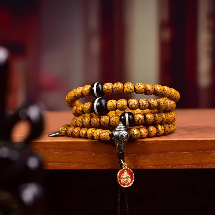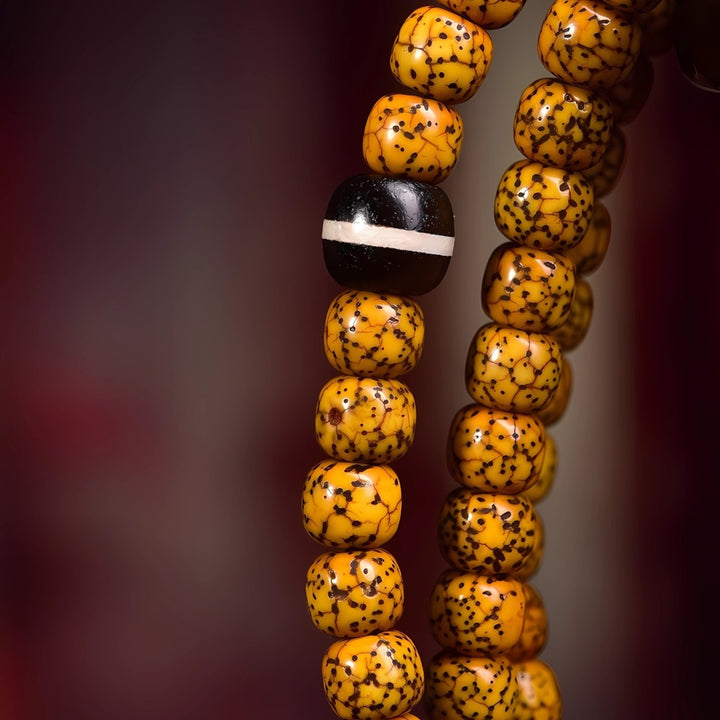 This mala combines the wisdom of aged Bodhi seeds with the focused clarity of the One-Line Dzi and the grounding strength of the Copper Guru bead. The Zaqi Lam bead offers protection and spiritual blessing, making this mala a powerful companion for meditation, prayer, and mindful living. Every element is selected for both its beauty and its energetic qualities, resulting in a piece that carries deep meaning and lasting value.