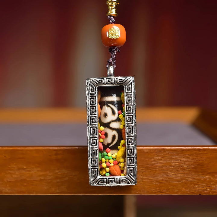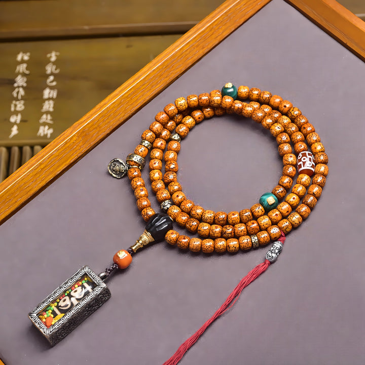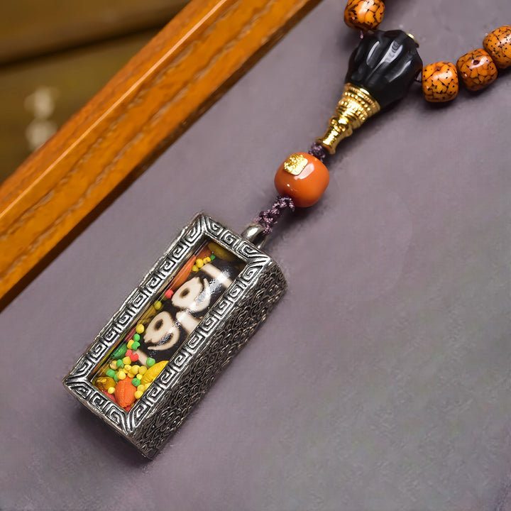 The sacred Gawu box holds a Zajiram Dzi bead for spiritual protection, while the Nine-Eyed Dzi symbolizes authority and compassion. Red Agate adds vitality, Malachite offers healing energy, and the Agate guru bead represents spiritual completion.