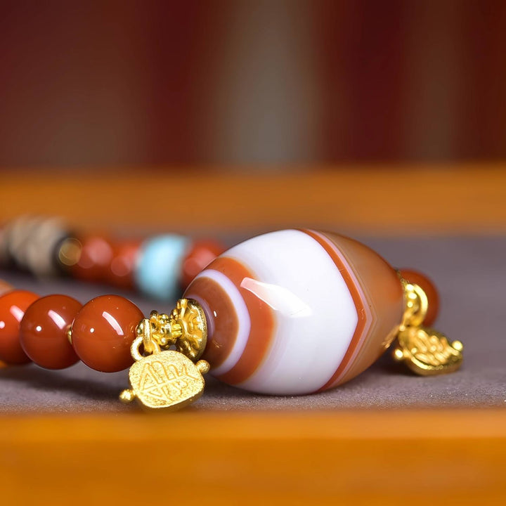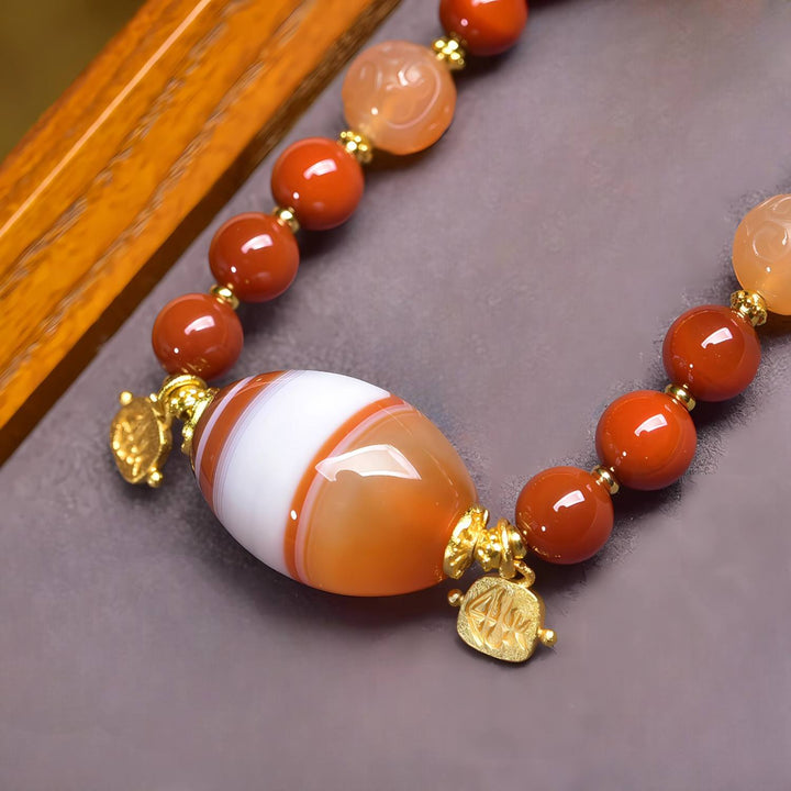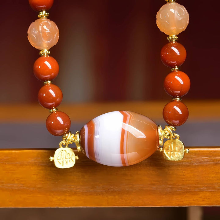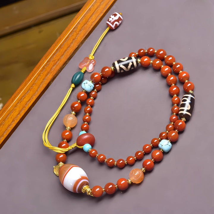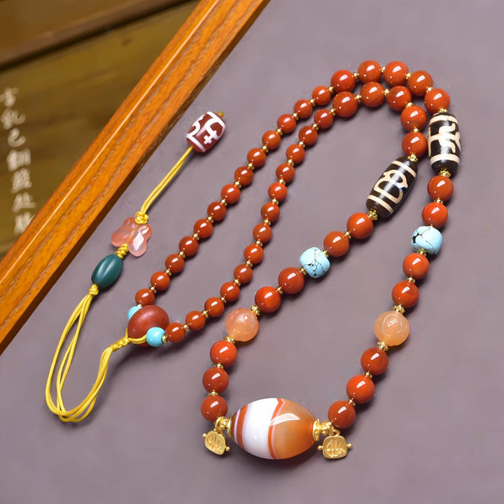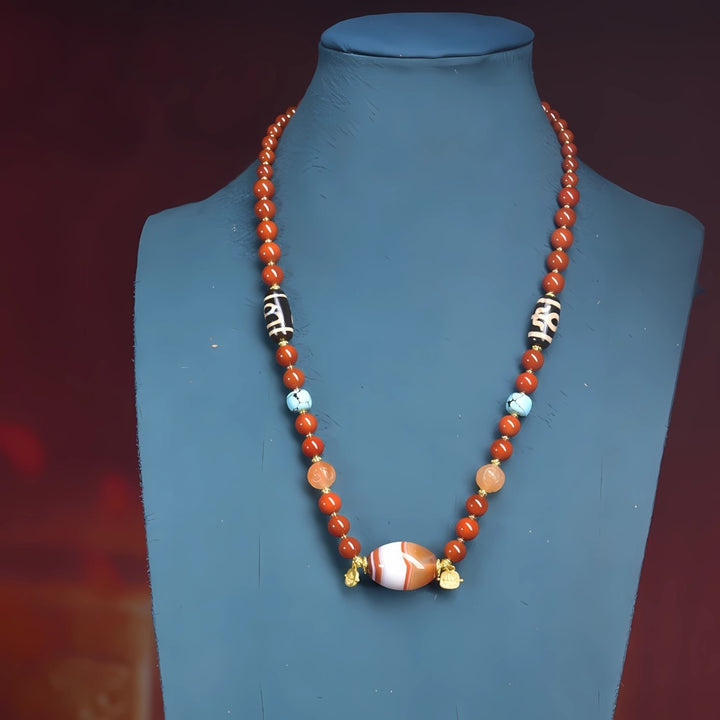 The Millennium Silk Bactrian Bead is regarded as a masterpiece of ancient beadwork, carrying the essence of centuries of trade, devotion, and cultural blending. Its fine weathered patina and intricate silk-like striations symbolize wisdom, endurance, and spiritual refinement. Combined with Dzi beads of wealth, fortune, and longevity, this piece becomes a powerful talisman for prosperity, protection, and enlightenment — as well as a rare collectible embodying ancient heritage.